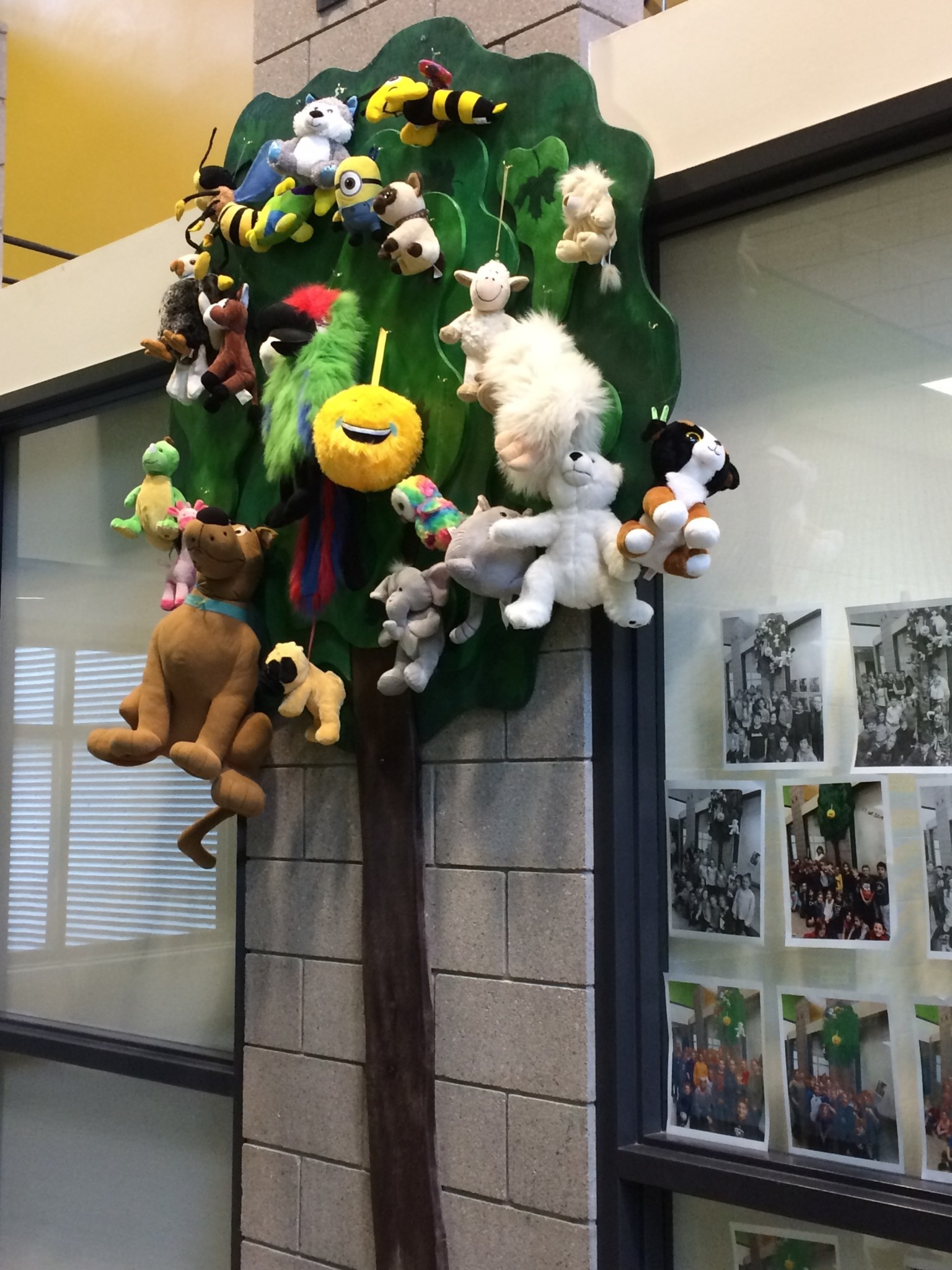 Toutes les classes qui accumulaient suffisamment de coupons bleus en vue de cette journée affichaient leur toutou de classe dans notre magnifique arbre. Puisque les 23 classes avaient atteint leur objectif, nous avons joué à la cachette. Les enseignants devaient trouver leurs élèves : il y en avait partout! Dans la garde-robe de la salle du personnel, sous des manteaux, dans des boîtes de papier, etc. Une élève a même passé plus de 20 minutes assise dans un lavabo sans que personne ne la trouve!