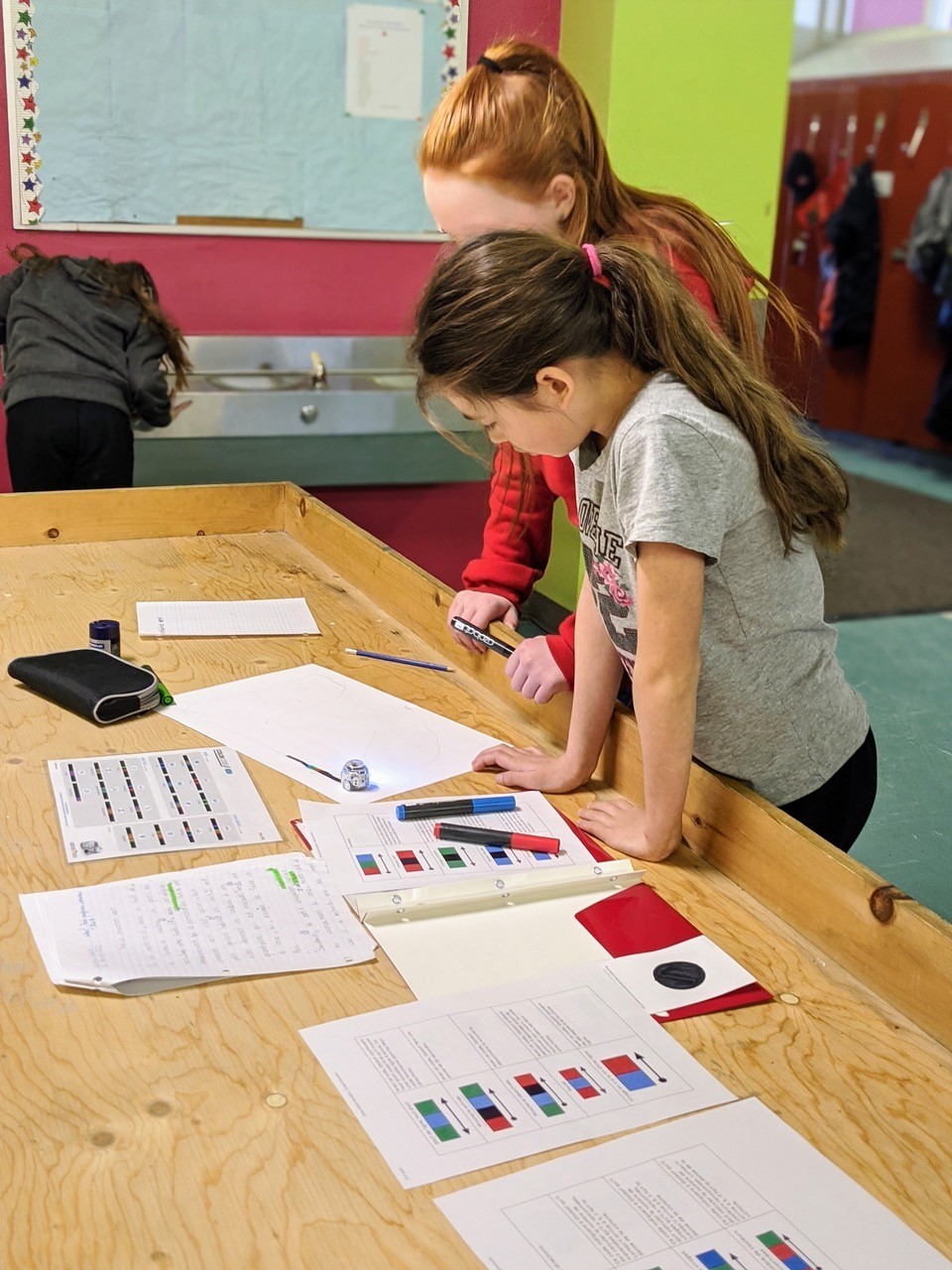 À la suite de l’écriture et de la correction de leur texte, les élèves ont fait le choix, en équipe, de leur version préférée. À l’aide du robot Ozobot et des techniques de programmation par code de couleur, les élèves ont ensuite préparé un parcours narratif pour le robot afin que celui-ci devienne le personnage de leur histoire. Résolution de problème, calculs, mesures, et pratique de lecture à voix haute étaient bien présents dans la conception de leur parcours, tout ça avec grand plaisir et engagement des élèves.