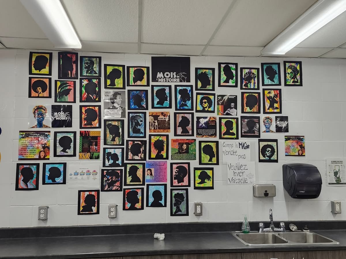 Afin de célébrer ce Mois à notre façon, les classes de la Formation préparatoire au travail de la première et deuxième année de l’école secondaire des-Studios ont réalisé une murale à l'entrée de l'école. Elle met en lumière certains personnages historiques qui ont fait évoluer l'histoire du Canada, mais aussi les gens inconnus qui se sont battus dans l'ombre et que nous ne devons pas oublier.