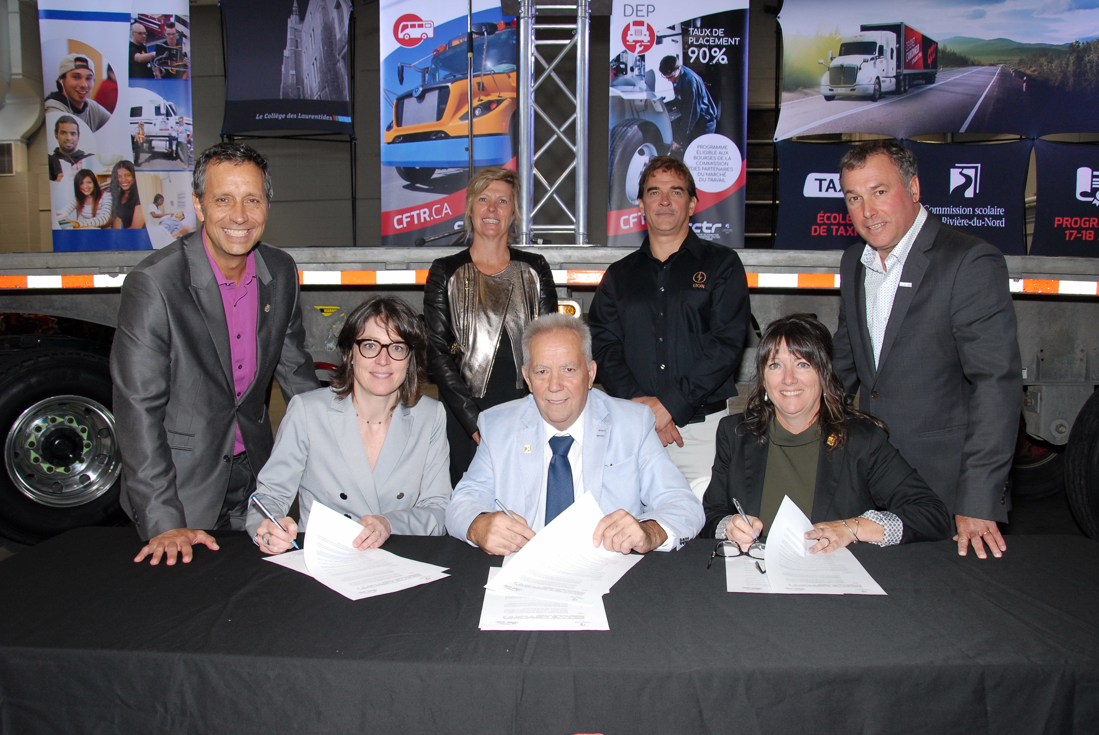 Le Centre de formation du transport routier de Saint-Jérôme (CFTR) de la Commission scolaire de la Rivière-du-Nord (CSRDN) offrira prochainement un nouveau volet au programme Mécanique de véhicules lourds routiers, soit Mécanique d’autobus et de véhicules électriques (VÉ). L’établissement de formation professionnelle a également convenu d’une entente de partenariat avec le Cégep de Saint-Jérôme qui permettra aux étudiants de l’Attestation d’études collégiales (AEC) en Technologies des véhicules électriques (VÉ) de suivre leur formation dans les locaux du CFTR. Ces deux annonces, qui consolident le premier pôle national d’expertise en formation sur les technologies des VÉ, ont été faites en présence du président et de la directrice générale de la CSRDN, M. Jean-Pierre Joubert et Mme Guylaine Desroches, de la directrice générale du Cégep, Mme Nadine Le Gal, du maire de Saint-Jérôme, M. Stéphane Maher, du maire de Mirabel, M. Jean Bouchard et du vice-président de La Compagnie électrique Lion, M. Benoit Morin.