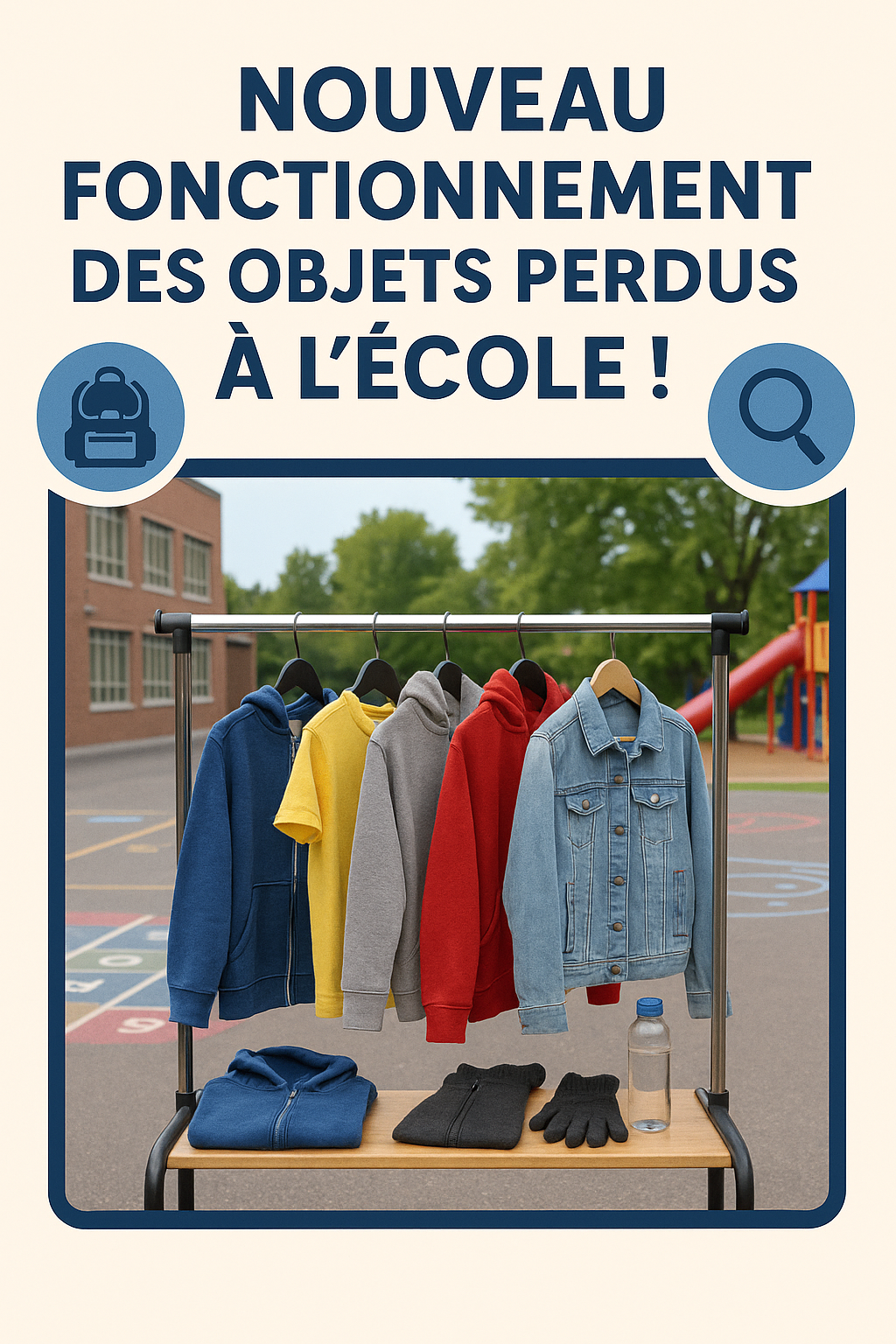 👕 Deux fois par semaine, les mercredis et les vendredis les objets perdus seront sortis dans la cour d’école à la sortie des classes (si la météo le permet).
